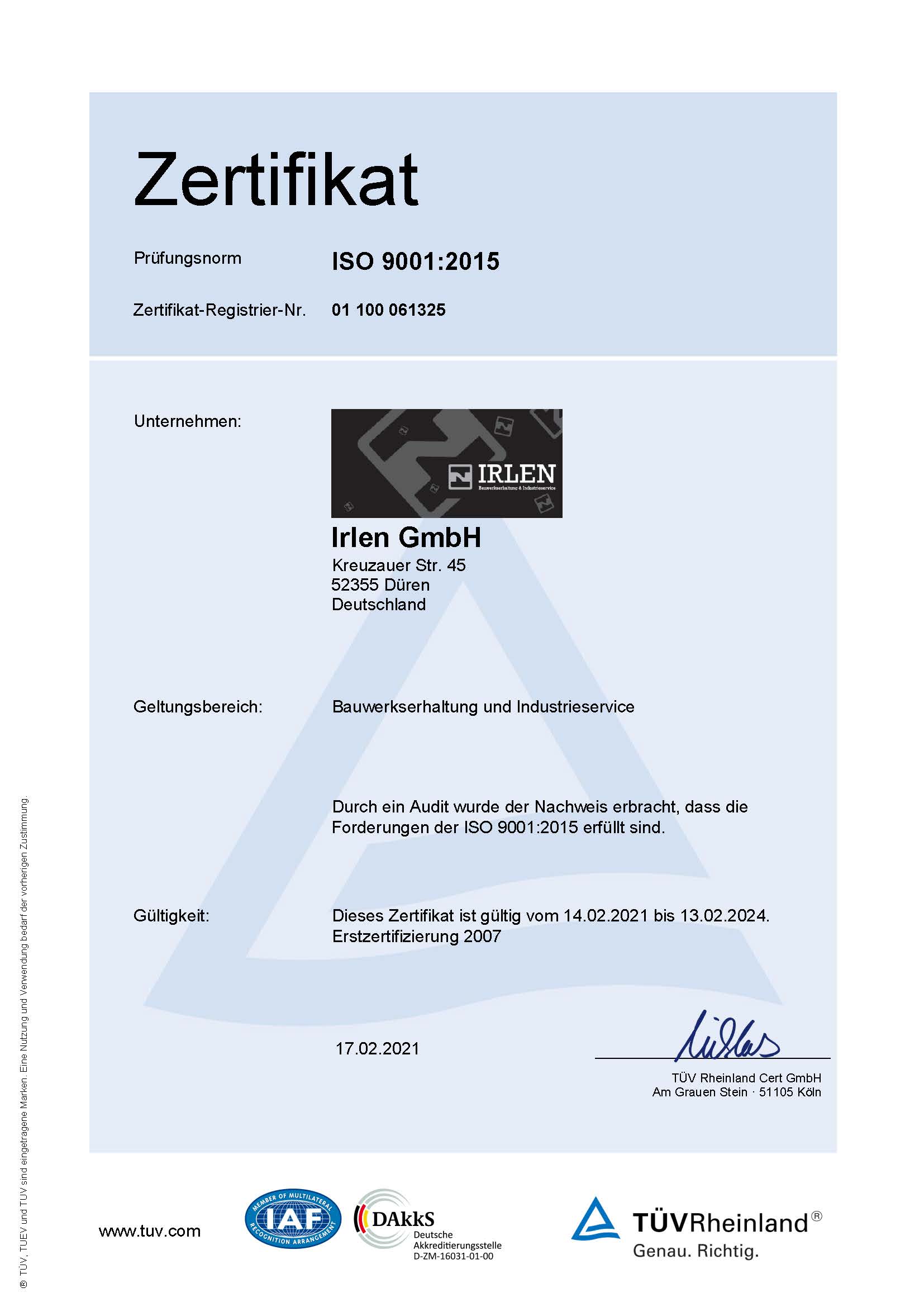 Qualität, Arbeitssicherheit und Umweltschutz der Irlen GmbH zertifiziert durch den TÜV Rheinland