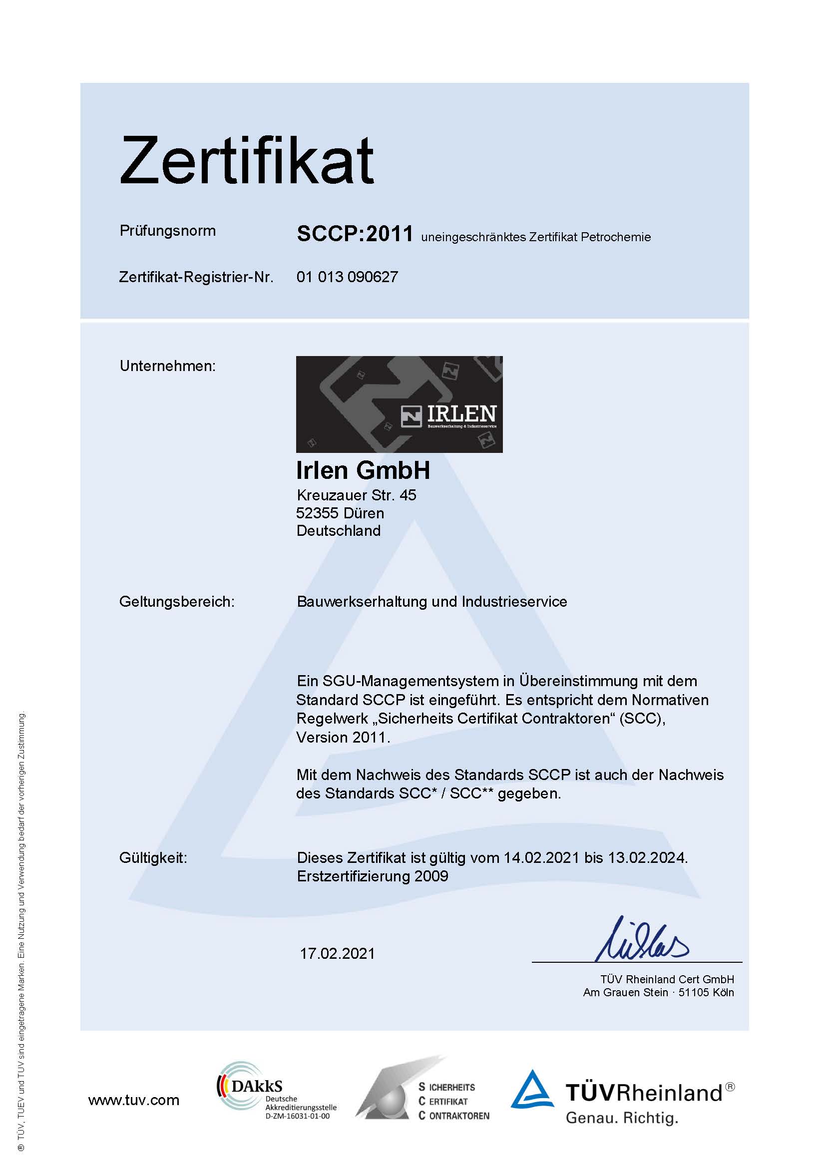 Somit war es auch in Bezug auf den Sicherheits-, und Gesundheits- und Umweltschutz (SGU) nur konsequent, dass wir diesen möglichst systematisch organisieren wollten. Wir haben uns deshalb schon 2008 zum Aufbau einer SGU-Managementsystems gemäß SCCP entschlossen und dieses im Mai 2008 erstmals durch den Rheinland zertifizieren lassen. Unser SCCP-System umfasst alle relevanten Bereiche des Unternehmens. Aus dieser Verpflichtung zur kontinuierlichen Verbesserung heraus ist es selbstverständlich, dass wir seit unserer Erstzertifizierung ohne zeitliche Unterbrechung über ein zertifiziertes SCC-System verfügen. In 2012 haben wir uns darüber hinaus entschlossen, die höchsten SCC-Anforderungen zu erfüllen und mit der Zertifizierung nach SCCP auch die Anforderungen der Petrochemie zu erfüllen. Wir stellen Ihnen deshalb unser aktuelles SCCP-Zertifikat, d. h. nach SCCP:2011, als Download zur Verfügung.